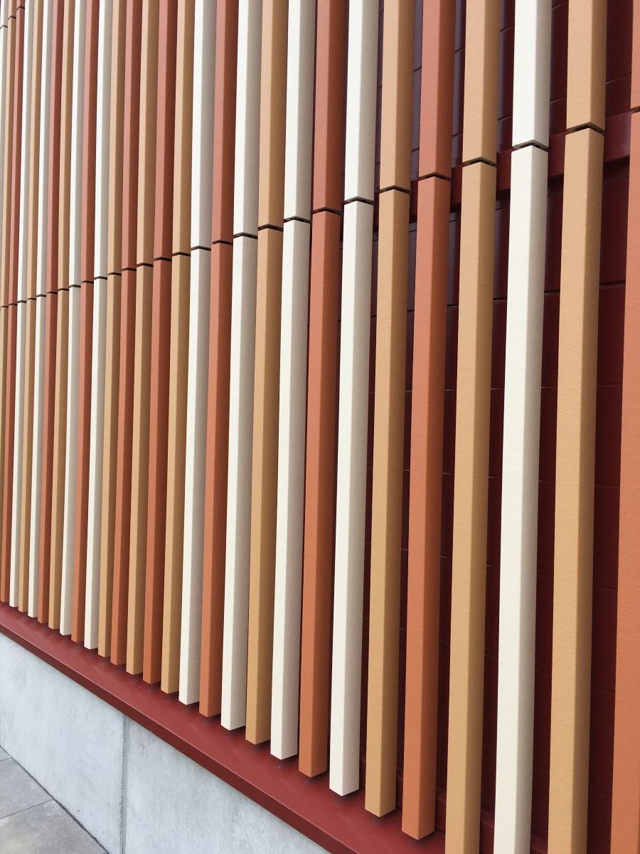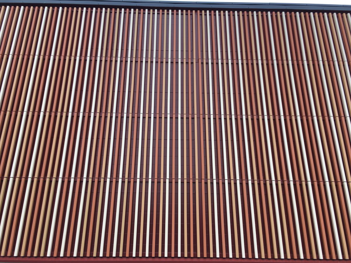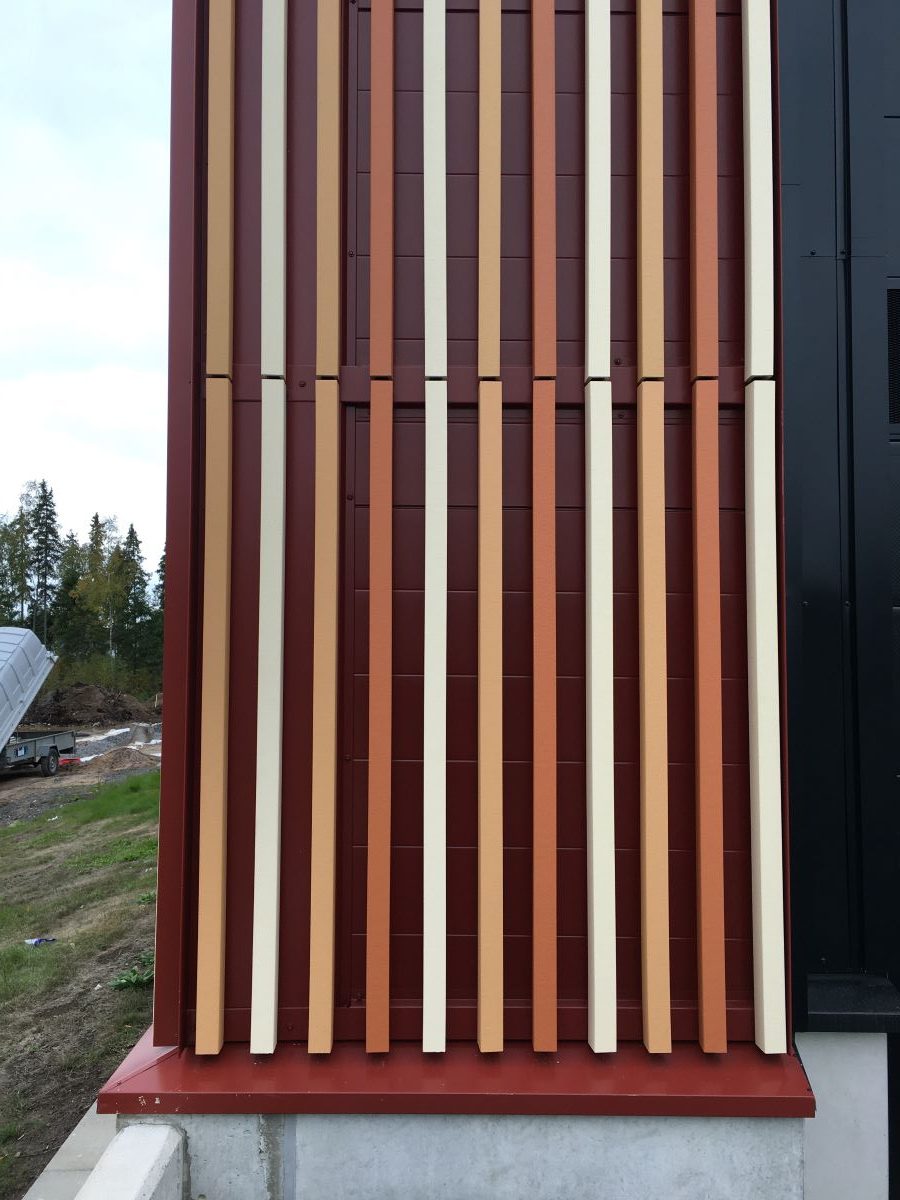 Paroc-pintaiset elementit vehoiltu NBK:n keraamisilla, lasittamattomilla Baguette-aurinkosäleillä.