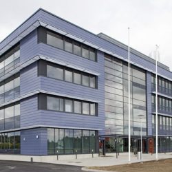 Halti Oy:n toimitalo Vantaan Valimotiellä. Rakennuksessa on käytetty NBK:mn lasitettuja sinisiä laattoja ja baguetteja.